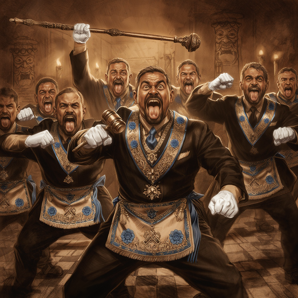 Tous ensemble : Un pas en avant jambes fléchies, signe d’égorgement, langue tirée et yeux écarquillés en criant :